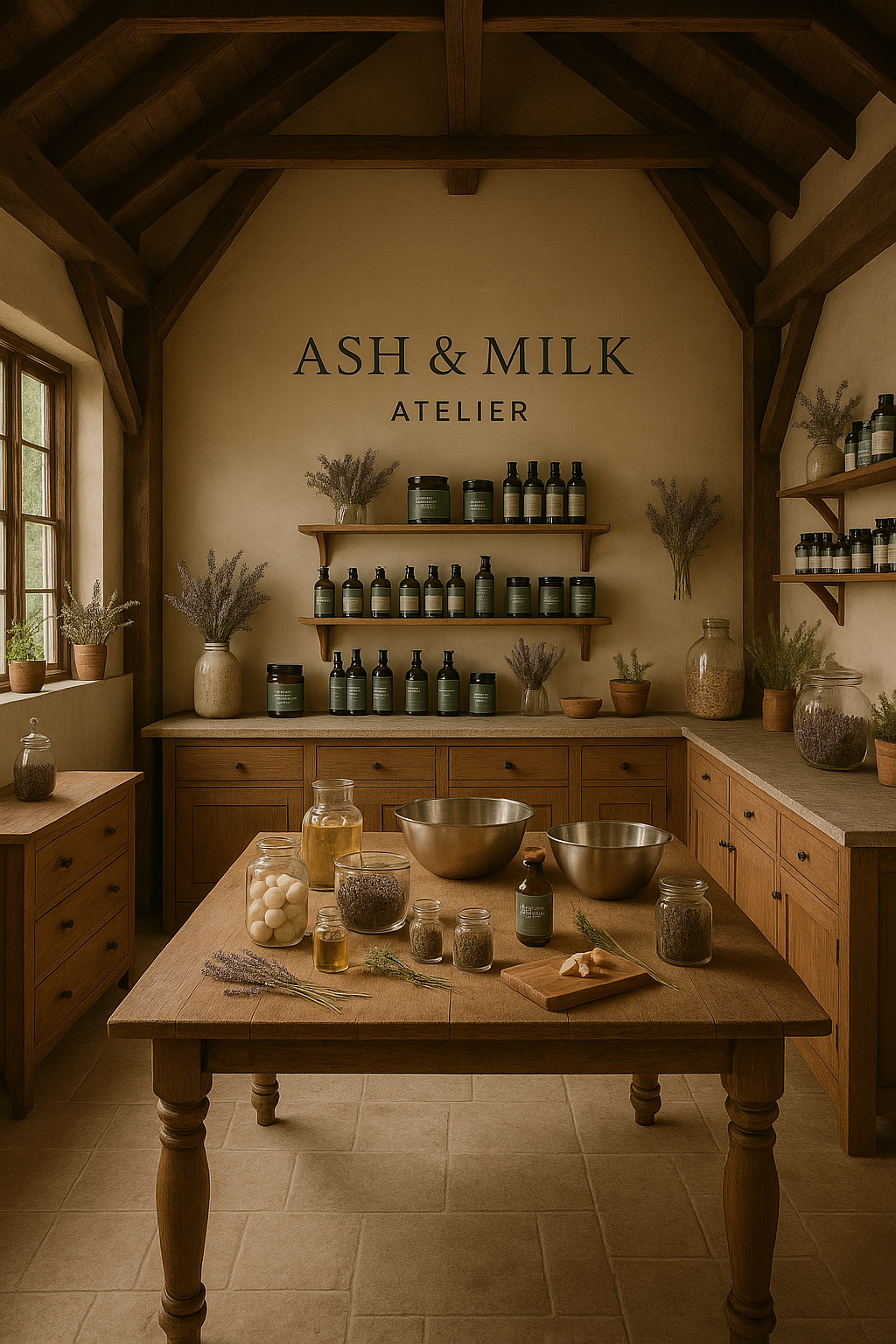 Ash & Milk is the signature skincare line of Thrivewell Estate—handcrafted in small batches using raw, nutrient-rich goat milk from our very own herd, lovingly raised on the grounds of the Estate. Every bar of soap, every jar of body butter, every bottle of serum is made on-site in the Ash & Milk Atelier, our dedicated production space where artistry, nature, and purpose meet.